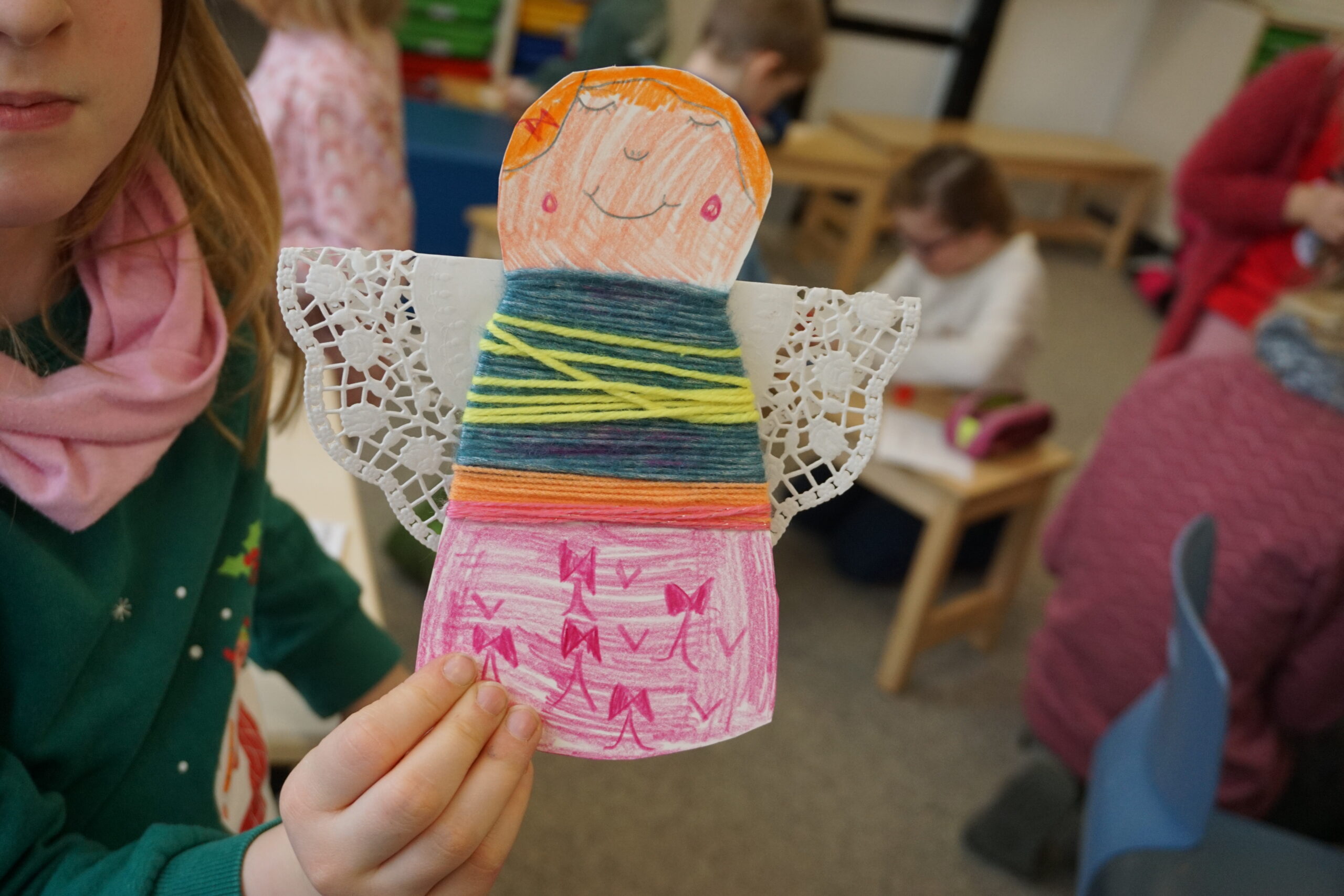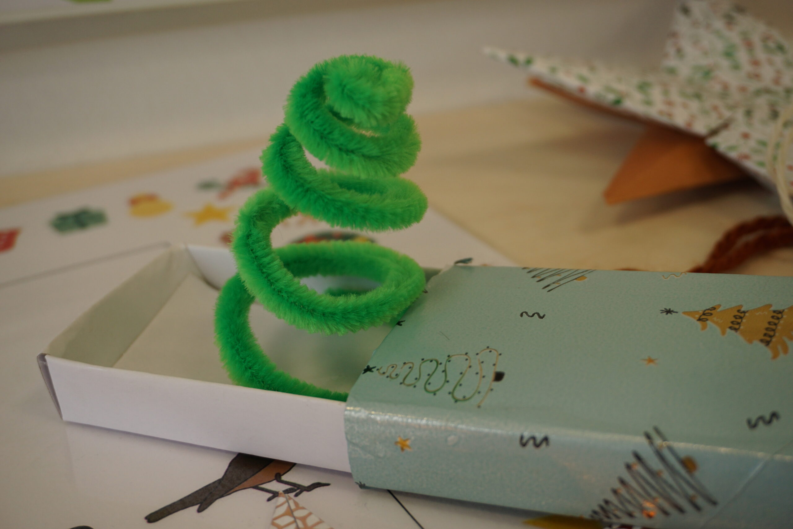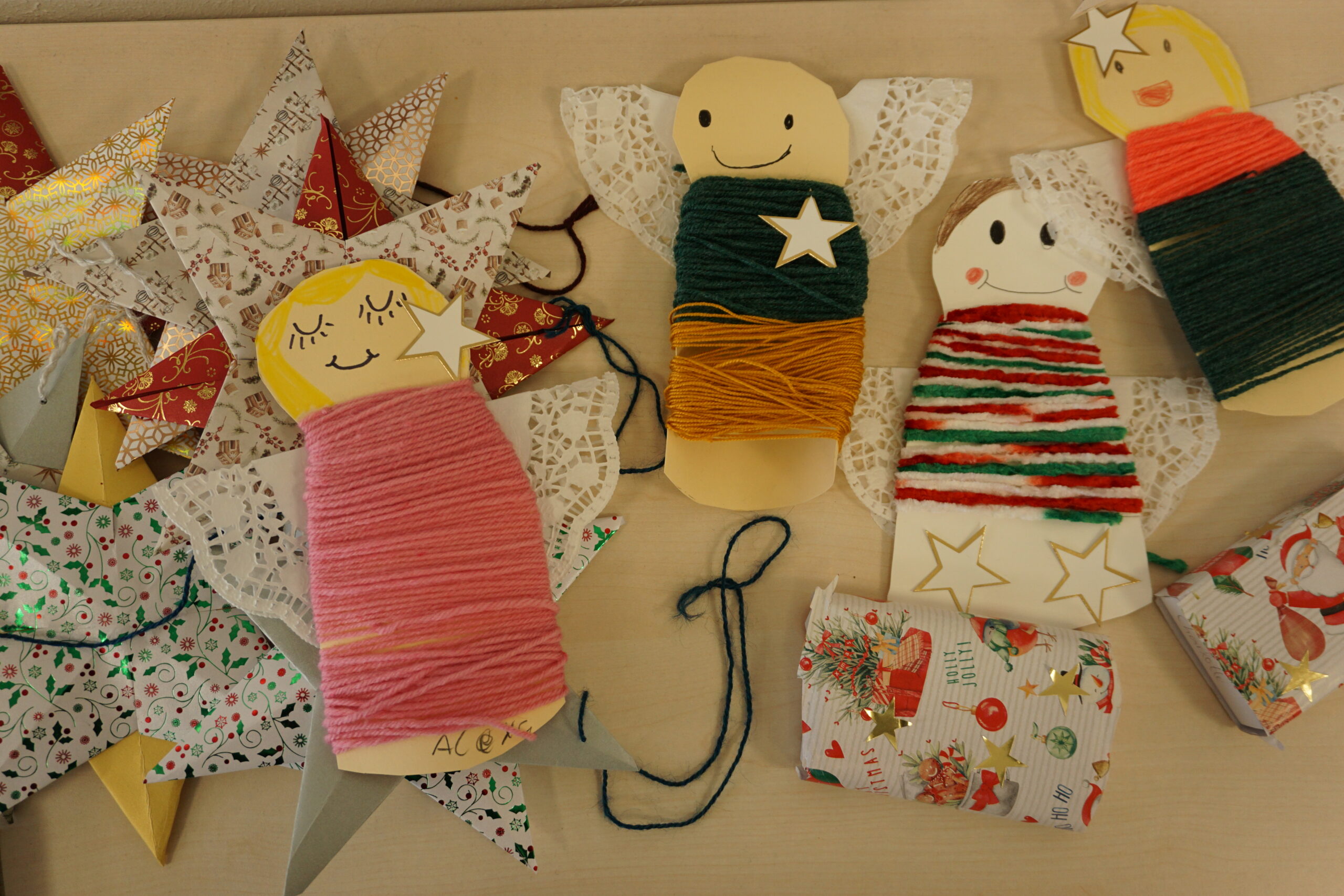 Besonders beliebt waren die Schneemänner aus Marmeladengläsern und Transparentpapier, die sofort Winterzauber verbreiteten. Ebenso viel Geduld und Geschick verlangten die miniaturhaften Tannenbäume aus Pfeifenputzern, die in bunt beklebten Streichholzschachteln Platz fanden. Mit Origamisternen aus farbenfrohem Weihnachtspapier und kleinen Engeln, die kunstvoll mit Wolle und Geschenkband umwickelt wurden, entstanden weitere liebevoll gestaltete Dekorationen für’s Klassenzimmer oder Geschenke für die Familien.