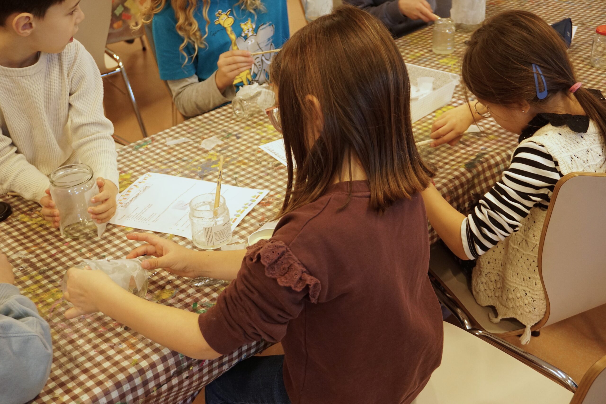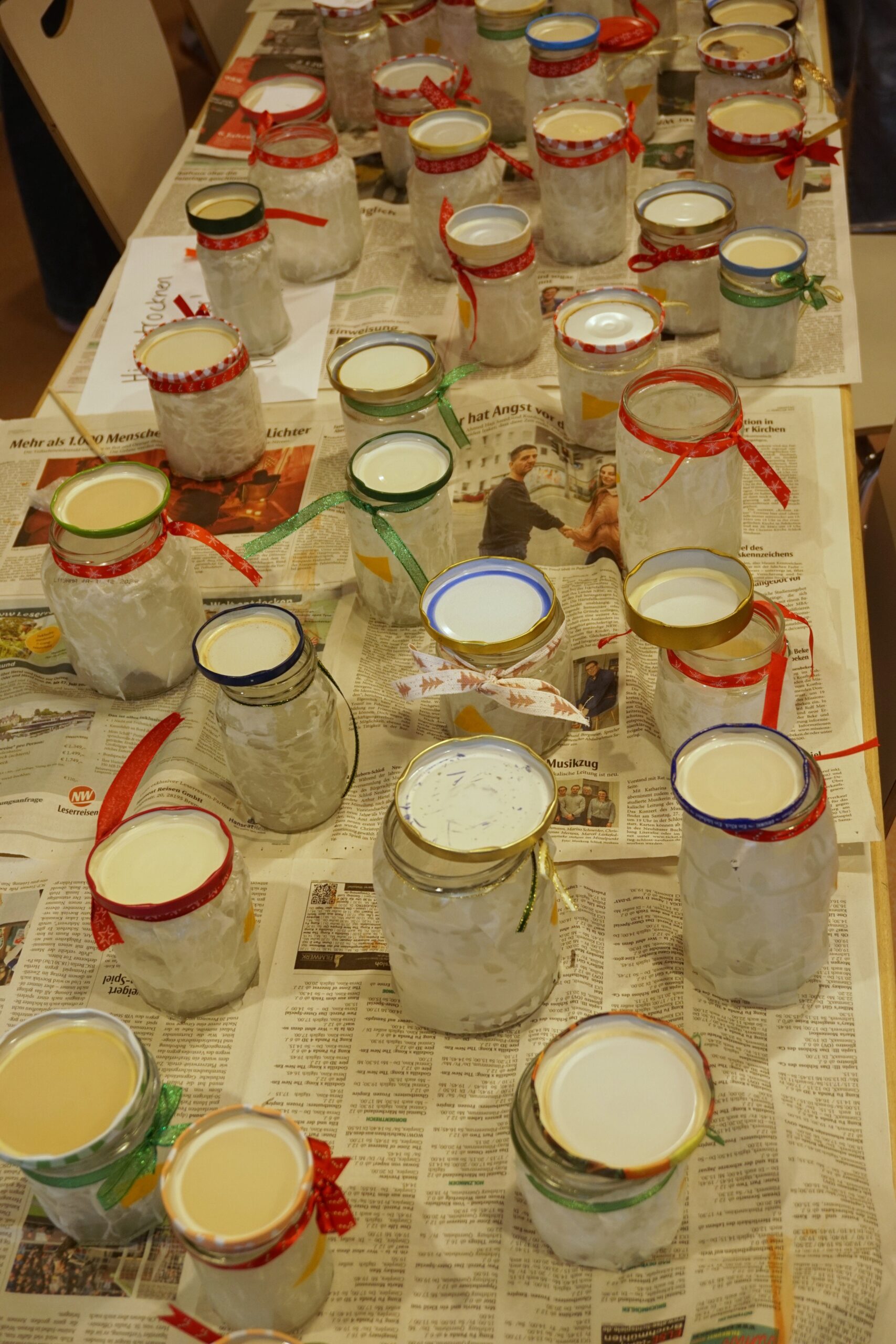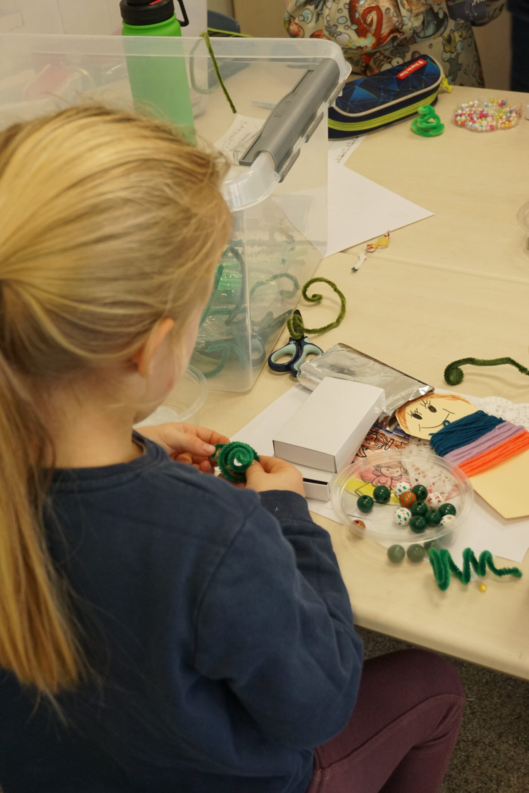 Besonders beliebt waren die Schneemänner aus Marmeladengläsern und Transparentpapier, die sofort Winterzauber verbreiteten. Ebenso viel Geduld und Geschick verlangten die miniaturhaften Tannenbäume aus Pfeifenputzern, die in bunt beklebten Streichholzschachteln Platz fanden. Mit Origamisternen aus farbenfrohem Weihnachtspapier und kleinen Engeln, die kunstvoll mit Wolle und Geschenkband umwickelt wurden, entstanden weitere liebevoll gestaltete Dekorationen für’s Klassenzimmer oder Geschenke für die Familien.