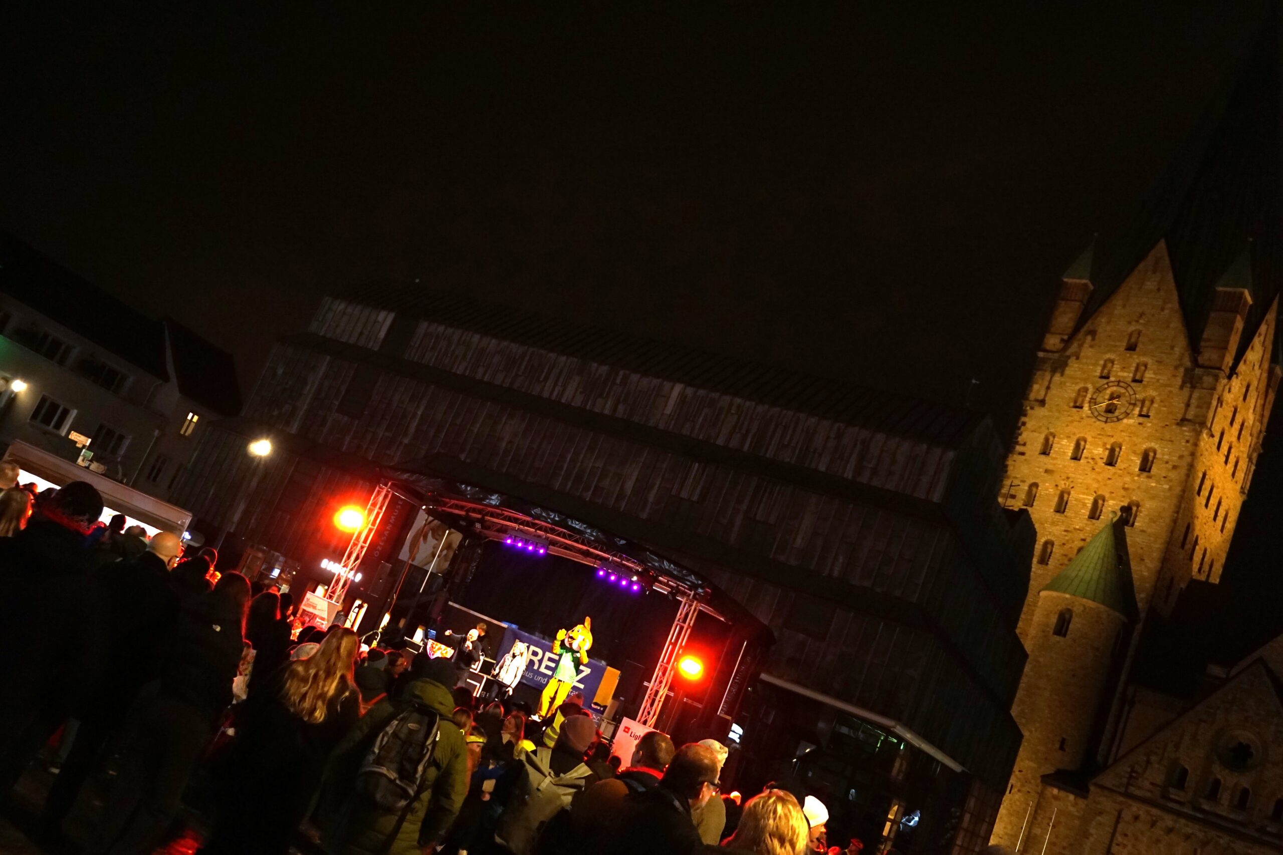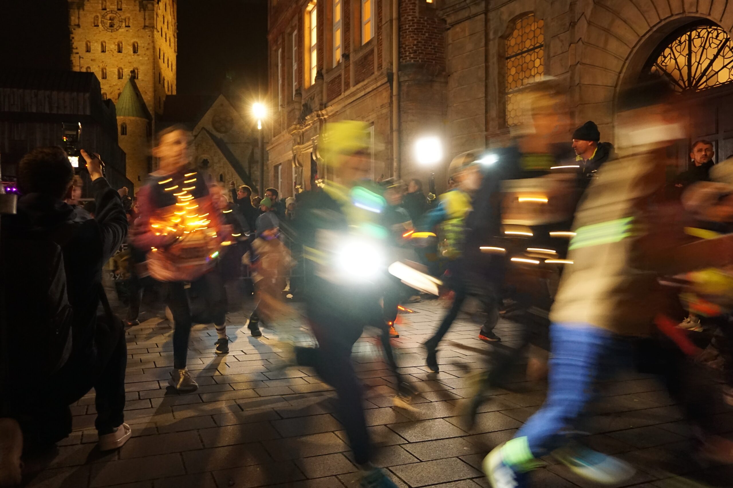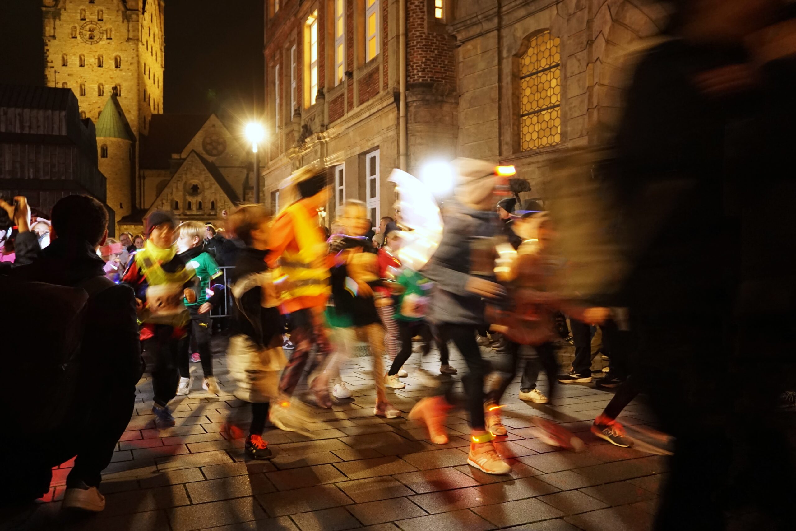 Am frühen Abend trafen sich alle Kinder und ihre Familien im Atrium unserer Schule. Dort herrschte große Vorfreude: Die grünen Schul-T-Shirts wurden angezogen, und viele Kinder schmückten sich zusätzlich mit bunten Leuchtarmbändern und Stirnlichtern. Gemeinsam ging es anschließend zum Domplatz, wo ein fröhliches Aufwärmprogramm mit Paola, dem Maskottchen des Paderborner Osterlaufs, stattfand. Gut vorbereitet und voller Energie machten sich die Kinder dann auf den Weg zum Start des 800-Meter-Grundschullaufs, der durch die stimmungsvoll beleuchtete Grube führte.